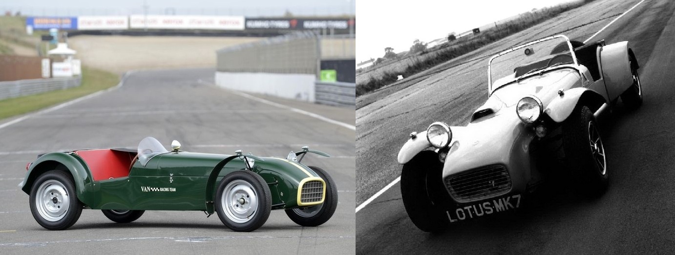 კომპანიის პირველი სერიული ავტომობილები, მათ შორის Mark VI და Lotus Seven, დიზაინით მინიმალისტური გახლდათ. ისინი ხშირად ე.წ. „Kit car“-ს ყიდდნენ. შეგეძლოთ თქვენივე ფარეხში, როგორც ლეგო ისე აგეწყოთ. კომფორტზე წინ, რა თქმა უნდა, მცირე წონა და კარგი მანევრი იდგა. ამ ფილოსოფიამ სრულყოფილებას 1960-იან წლებში, Lotus Elan-ის დამსახურებით მიაღწია.